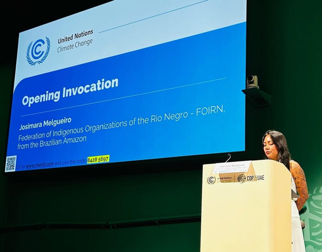 A voz das mulheres rionegrinas na COP28 foi representada pela Josimara Baré, Coordenadora do Fundo Indígena do Rio Negro (FIRN), que fez parte da delegação da Rede de Cooperação Amazônica (RCA). Ela participou de debates sobre financiamento climático, apresentando a experiência bem-sucedida do FIRN, realizado pela Foirn no Rio Negro, como um exemplo de mecanismo de financiamento direto aos povos indígenas, gerido por eles próprios em seus territórios. O Presidente da Foirn, Marivelton Baré, também foi uma das lideranças da Amazônia Brasileira presentes na COP28.